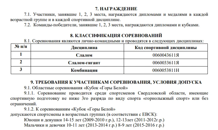 Соревнование проводится среди спортсменов Свердловской области, имеющие спортивную подготовку не ниже 3го разряда по виду спорта «горнолыжный спорт» или без ограничений.