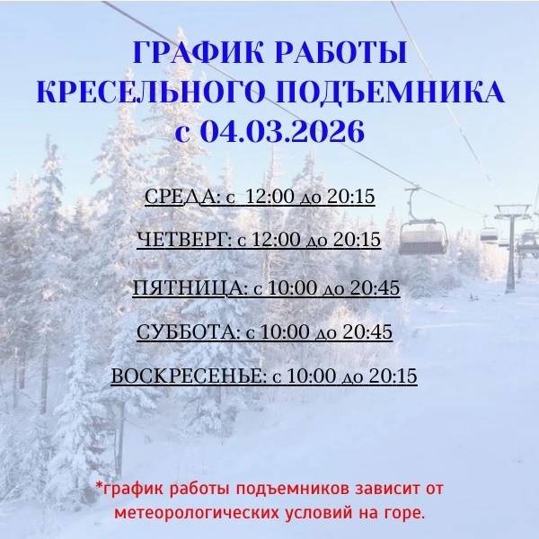 С 04.03.26 кресельный подъёмник будет работать со среды по воскресенье.